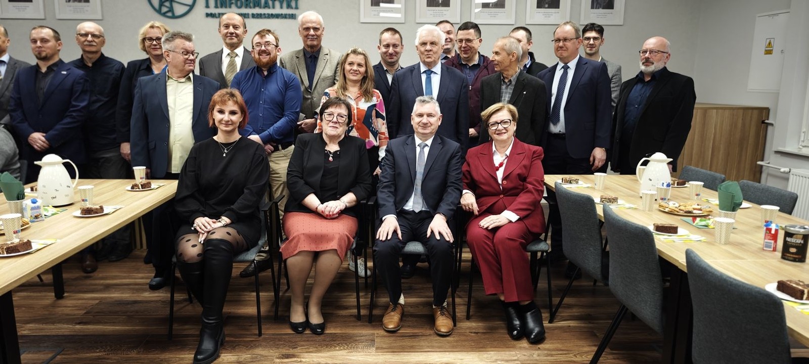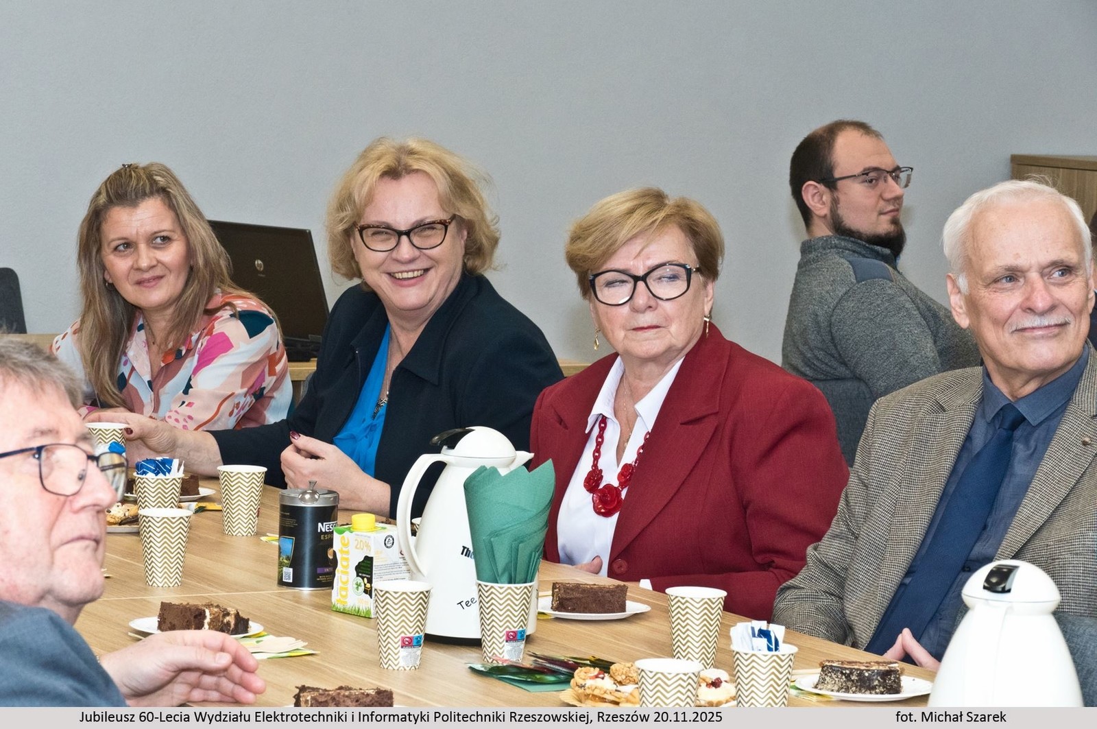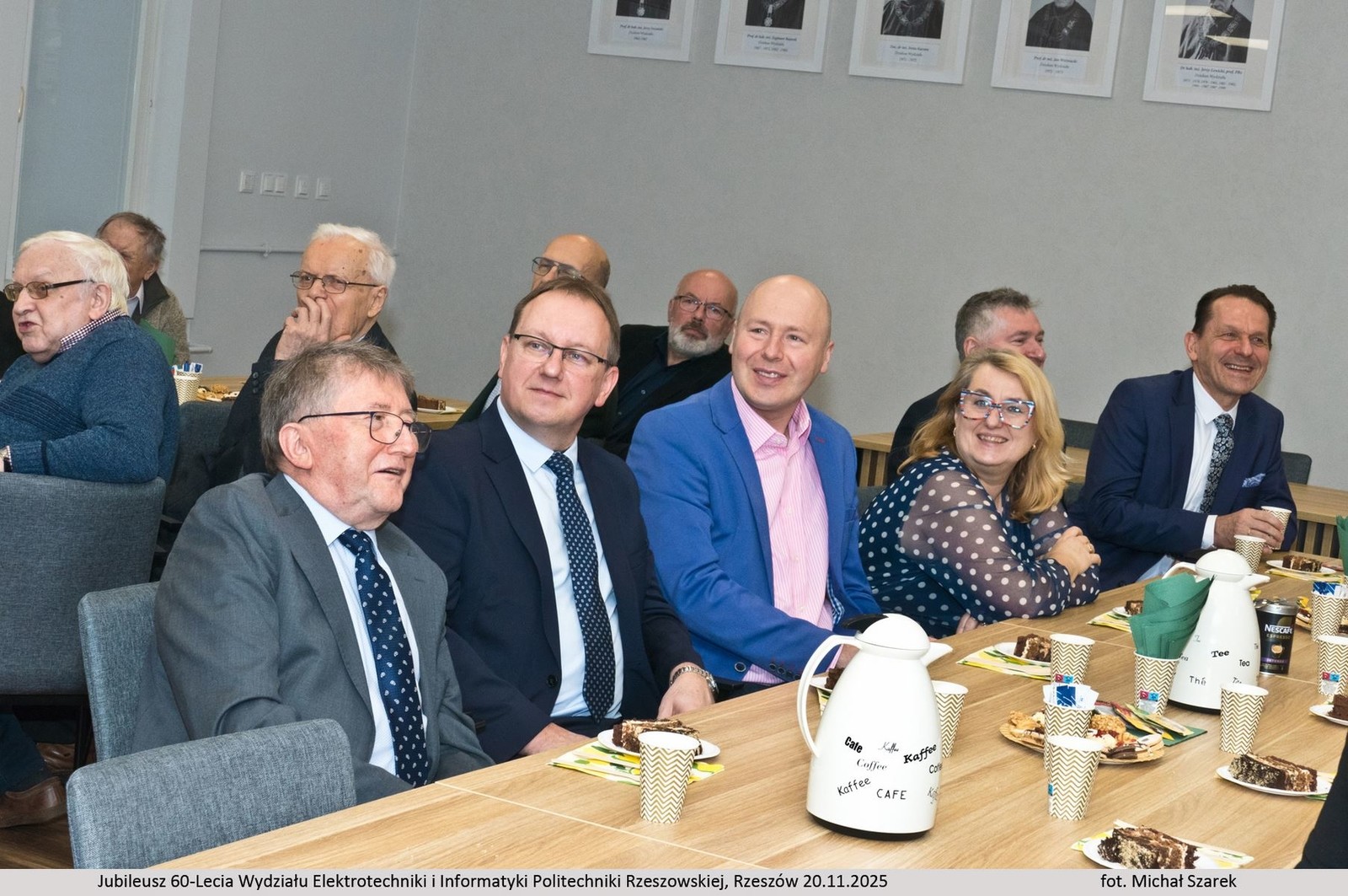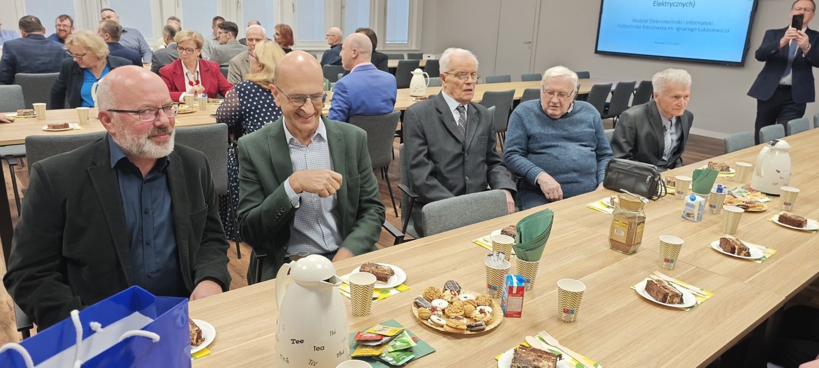Z okazji obchodów 60-lecia powstania Wydziału Elektrotechniki i Informatyki (dawniej Wydział Elektryczny) Politechniki Rzeszowskiej im. Ignacego Łukasiewicza w dniu 20.11.2025 odbyło się okolicznościowe spotkanie pracowników (obecnych i byłych - w tym emerytowanych) Zakładu Elektrodynamiki i Systemów Elektromaszynowych. Zakład Elektrodynamiki i Systemów Elektromaszynowych (dawniej Zakład Maszyn Elektrycznych) był jedną z pierwszych jednostek organizacyjnych wydziału powstałych 1965 roku. Spotkanie było doskonałą okazją nie tylko do wspomnień, ale też do wręczenia listu gratulacyjnego najstarszemu emerytowanemu pracownikowi jednostki, a jednocześnie wydziału Panu mgr. inż. Ryszardowi Schabowi. Pan mgr inż. Ryszard Schab jest niezwykle zasłużonym nauczycielem akademickim, który w listopadzie 1965 roku rozpoczął pracę zawodową na powstałym Wydziale Elektrycznym Wyższej Szkoły Inżynierskiej. List gratulacyjny podpisany przez Rektora Politechniki Rzeszowskiej im. Ignacego Łukasiewicza prof. dr hab. inż. Piotra Koszelnika wręczył w jego imieniu Dziekan Wydziału Elektrotechniki i Informatyki dr hab. inż. Roman Zajdel, prof. uczelni w obecności kierownika Zakładu Elektrodynamiki i Systemów Elektromaszynowych dr hab. inż. Mariusza Korkosza, prof. uczelni oraz przybyłych na spotkanie pracowników Zakładu Elektrodynamiki i Systemów Elektromaszynowych.