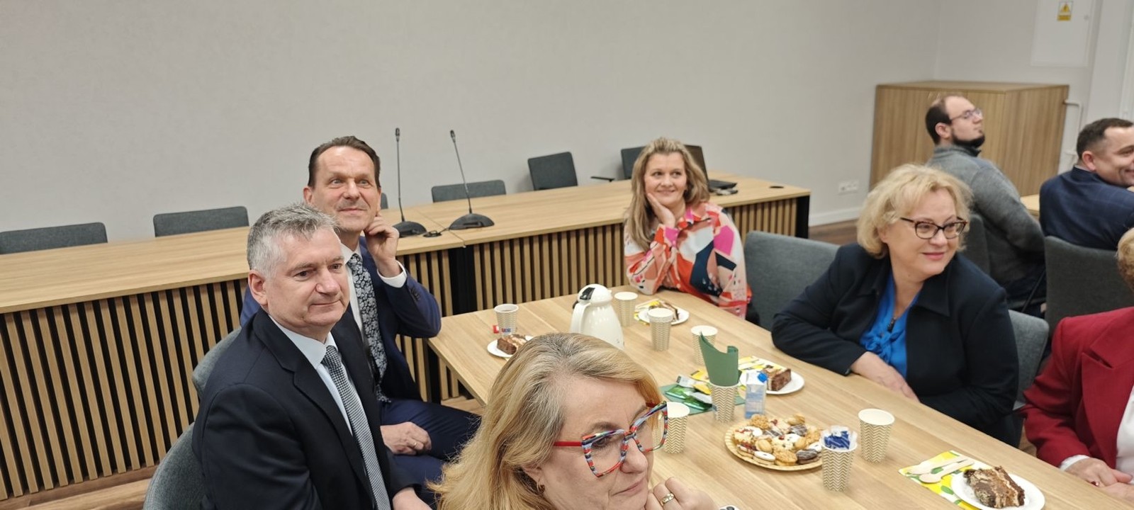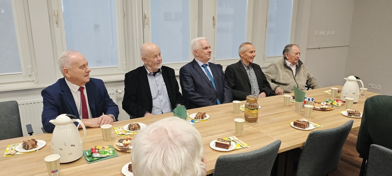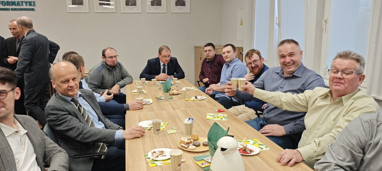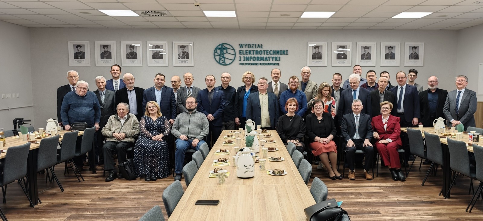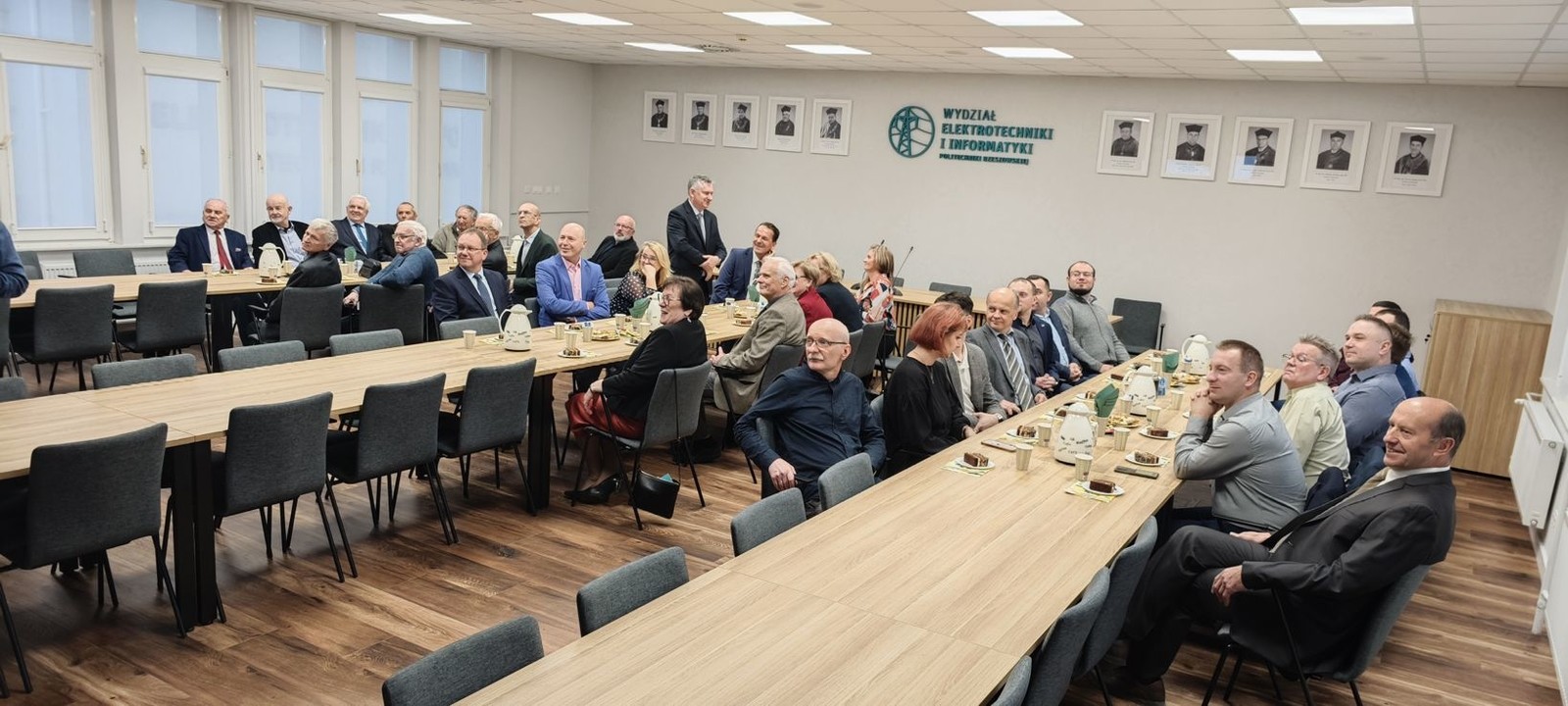 Z okazji obchodów 60-lecia powstania Wydziału Elektrotechniki i Informatyki (dawniej Wydział Elektryczny) Politechniki Rzeszowskiej im. Ignacego Łukasiewicza w dniu 20.11.2025 odbyło się okolicznościowe spotkanie pracowników (obecnych i byłych - w tym emerytowanych) Zakładu Elektrodynamiki i Systemów Elektromaszynowych. Zakład Elektrodynamiki i Systemów Elektromaszynowych (dawniej Zakład Maszyn Elektrycznych) był jedną z pierwszych jednostek organizacyjnych wydziału powstałych 1965 roku. Spotkanie było doskonałą okazją nie tylko do wspomnień, ale też do wręczenia listu gratulacyjnego najstarszemu emerytowanemu pracownikowi jednostki, a jednocześnie wydziału Panu mgr. inż. Ryszardowi Schabowi. Pan mgr inż. Ryszard Schab jest niezwykle zasłużonym nauczycielem akademickim, który w listopadzie 1965 roku rozpoczął pracę zawodową na powstałym Wydziale Elektrycznym Wyższej Szkoły Inżynierskiej. List gratulacyjny podpisany przez Rektora Politechniki Rzeszowskiej im. Ignacego Łukasiewicza prof. dr hab. inż. Piotra Koszelnika wręczył w jego imieniu Dziekan Wydziału Elektrotechniki i Informatyki dr hab. inż. Roman Zajdel, prof. uczelni w obecności kierownika Zakładu Elektrodynamiki i Systemów Elektromaszynowych dr hab. inż. Mariusza Korkosza, prof. uczelni oraz przybyłych na spotkanie pracowników Zakładu Elektrodynamiki i Systemów Elektromaszynowych.